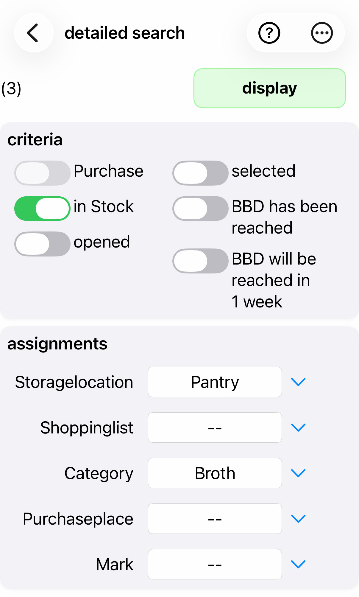 The 'Shopping lists' button provides a sorted list of all existing shopping lists, with the number of products in each list shown in brackets. When one of these is selected (as with the storage location, possibly in two steps), the contents of the respective shopping list are displayed.